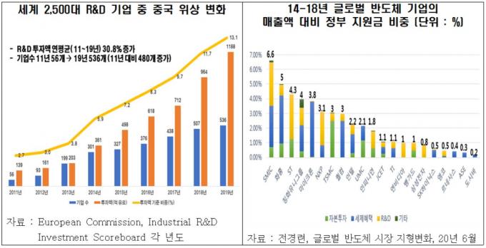 이 같은 중국의 부상은 중국 정부의 막대한 자금지원에서 비롯되는데 경제협력개발기구(OECD) 통계에 따르면 2014~2018년 매출액 대비 정부 지원금 비중이 가장 높은 상위 5개 반도체 기업 중 3개가 중국이었다.