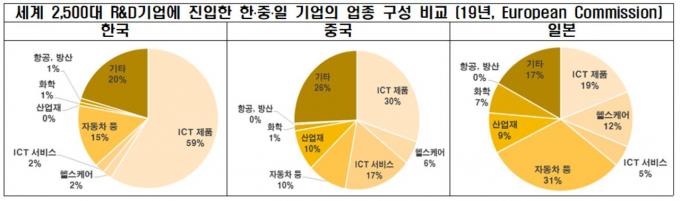 2019년 2500대 R&D 기업에 진입한 한국과 중국, 일본 기업의 업종별 구성을 살펴보면 한국의 경우 ICT 제품 비중이 58.9%에 달했다.