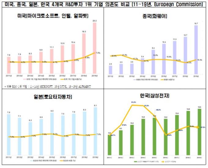 또 2019년 한국과 미국, 일본, 중국의 R&D 투자 1위 기업이 자국 전체 투자에서 차지하는 비중을 살펴보면 한국의 삼성전자는 47.2%나 됐다.