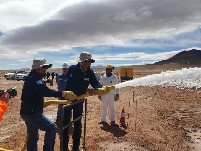 ▲ 최정우 포스코 회장이 2019년 10월 19일 아르헨티나 옴브레 무에르토 염호 리튬 추출 데모플랜트 건설 현장을 방문해 지하 염수 추출 시현을 하고 있다. [포스코 제공]