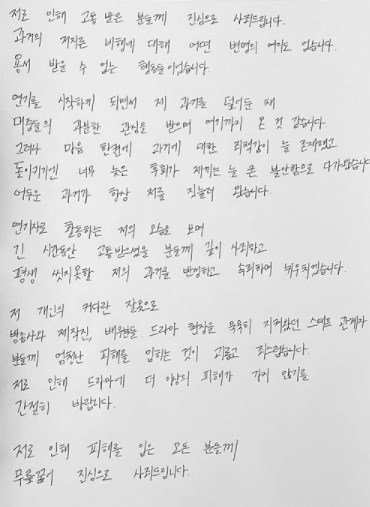 그러면서 "저로 인해 피해를 입은 모든 분께 무릎 꿇어 진심으로 사죄드립니다"라고 적었다.