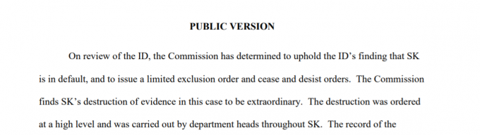 이날 ITC는 SK가 고위층이 지시해 전사적으로 증거 인멸에 나선 일은 심각한 수준이라고도 언급했다. ITC는 "자료 수집·파기가 SK에서 만연하고 있었고 묵인됐음을 확인한다"며 "SK가 정기적인 관행이라는 변명으로 노골적으로 악의를 갖고 문서 삭제·은폐 시도를 했다고 판단한다"고 설명했다.