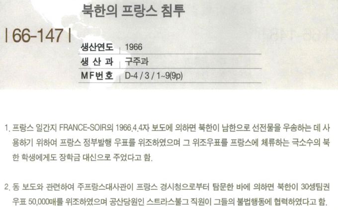 비밀에서 해제된 '대한민국 외교사료 해제집 Ⅳ'(1966~1967년)에 보면, 외교부 구주과에서 생산한 '북한의 프랑스 침투'라는 제목의 정보보고가 눈에 띈다.