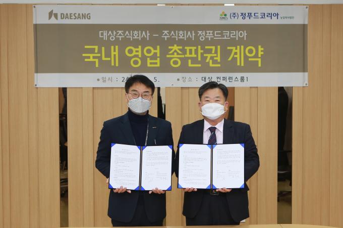 대상과 정푸드코리아는 5일 서울 중랑구 상봉동 대상빌딩에서 대상 이강덕 영업본부장과 정푸드코리아 정보헌 회장 등 양사 관계자들이 참석한 가운데 협약식을 갖고 향후 3년간 국내 영업권 독점과 신제품 공동 개발 등에 합의했다.
