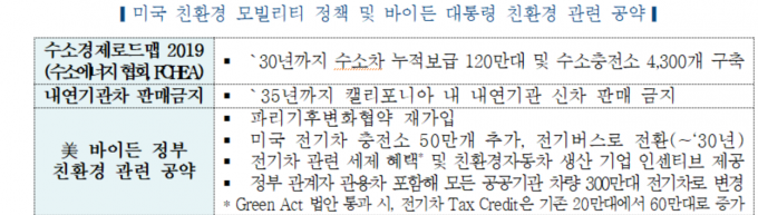 바이든 정부는 공약을 통해 △파리기후변화협약 재가입 △2030년까지 전기차 충전소 50만 개 추가 △전기차 관련 세제 혜택 및 친환경자동차 생산 기업 인센티브 제공 △정부 관용차 및 공공기관 차량 300만 대 전기차로 변경 등을 추진 중이다.