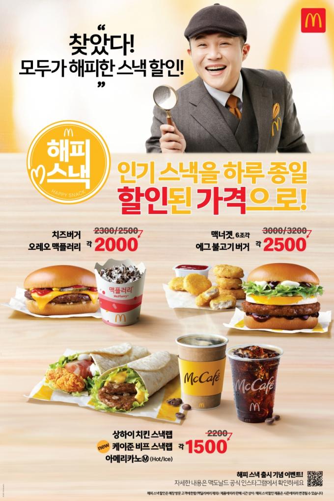 한편, 맥도날드는 해피 스낵의 출시를 알리기 위해 최근 많은 사랑을 받고 있는 개그맨 조세호를 광고모델로 발탁했다. 해피 스낵은 전국 맥도날드 매장에서 11일 오전 4시부터 만나볼 수 있으며, 제품에 따라 판매 시간은 일부 달라진다. 맥딜리버리, 배달의 민족 등 배달 주문시 할인은 미적용 된다.