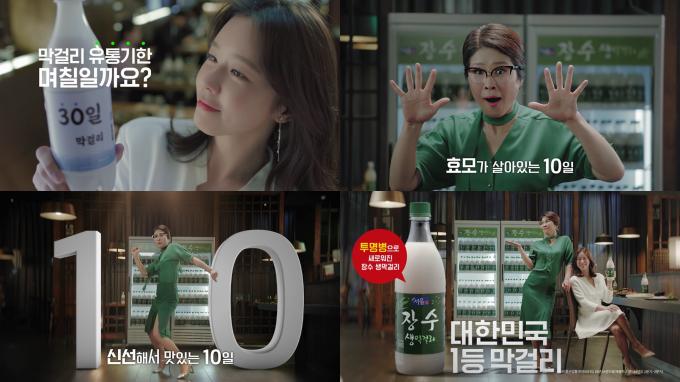 ▲ 배우 황석정과 경수진이 모델인 '장수 생막걸리' TV 광고 [서울 장수 막걸리 제공]