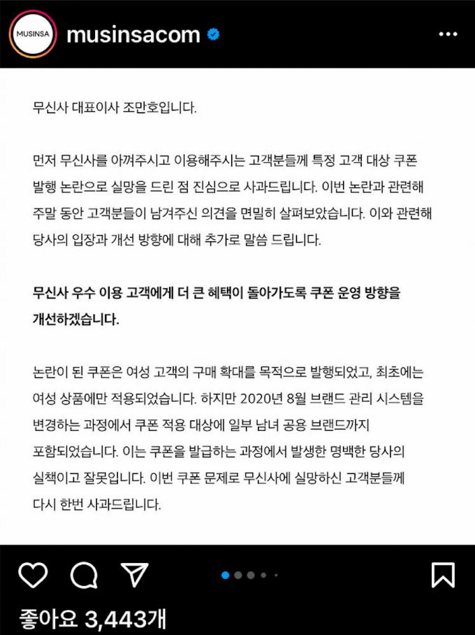 조만호 무신사 대표이사가 최근 불거진 '성차별 쿠폰 지급 논란'에 대해 직접 사과했다.