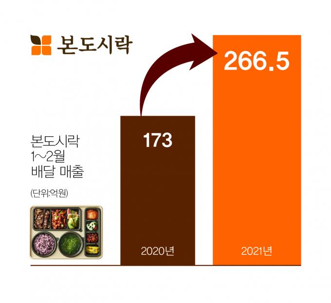 특히 본도시락은 코로나19가 발병한 작년 한 해, 연간 고객 매출 1400억 원을 돌파했으며, 12월에는 월 매출 180억 원을 기록하며 역대 최고의 성적을 내기도 했다. 또한 2020년 전체 배달 매출 역시 2019년 대비 22.8% 상승했다.