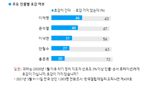 한국갤럽이 지난 9~11일 전국 유권자 1003명에게 작년 1월 이후 차기 정치 지도자 조사에서 선호도 3% 이상 기록한 다섯명의 인물 각각에 대한 호감도를 물은 결과, 이 지사의 호감도는 46%였다. 비호감도(43%)보다 호감도의 비율이 컸다.
