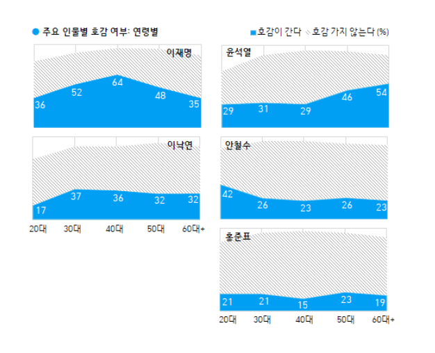윤 전 총장은 40%의 호감도로 이 지사의 뒤를 이었다. 비호감도는 47%였다. 국민의힘 지지층(85%), 보수층(64%), 대구·경북 지역(57%) 등에서 호감도가 높았고 연령별 호감도는 20~40대 30% 내외, 50대 46%, 60대 이상에서 54%였다.