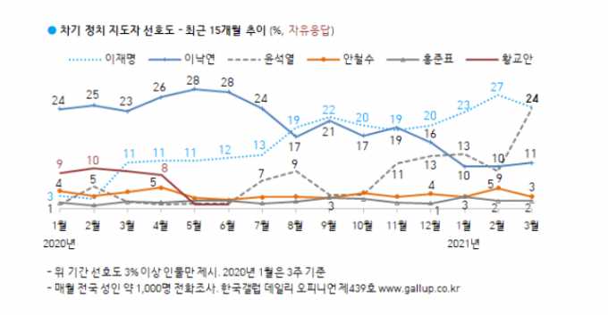 다만 한국갤럽은 "이 전 대표의 지지율은 2019년 12월 당시 민주당 지지층 등 정치성향 진보층에서 약 70%에 달했던 호감도가 2021년 3월 현재 50%대, 연령별로도 30~50대 60% 내외에서 30%대로 바뀌었다"라고 밝혔다.