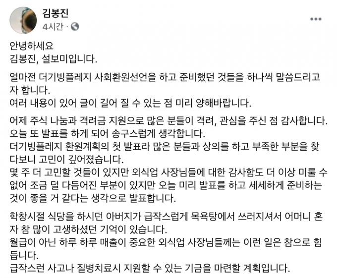 "재산 절반 환원, 5000억 아닌 더 큰 가치로 사회에 환원되도록 노력" 배달의민족의 창업자인 김봉진(45) 우아한형제들 의장이 외식업 운영자들의 의료·생계비 등을 위해 200억 원을 지원한다.