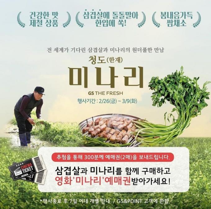 GS더프레시는 지난 9일까지 청도 미나리를 삼겹살과 함께 구매한 고객을 대상으로 추첨을 통해 300명에게 영화 '미나리' 예매권을 증정하는 행사를 진행했다.