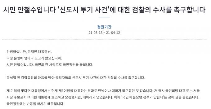 ▲ 국민의당 안철수 대표가 청와대 국민청원 게시판에 올린 '한국토지주택공사(LH) 투기 사건' 관련 청원 [청와대 홈페이지 캡처]