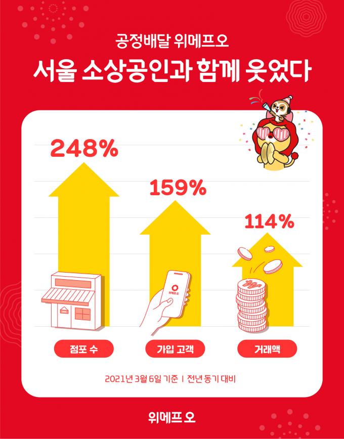 위메프오는 서울시 제로배달 유니온 참여 후 3개월 만에 서울 지역 입점 점포 수가 전년 동기 대비 3배 증가했다고 15일 밝혔다.(2021년 3월6일 기준)