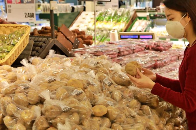 롯데마트는 농림축산식품부 주관의 '대한민국 농할(농산물 할인) 갑시다' 할인을 적용해 국산 감자(900g)를 3900원대에 판매한다.