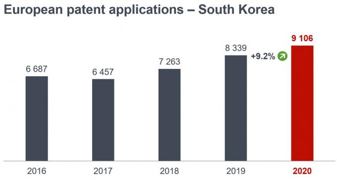우리나라는 코로나19 세계 대유행에도 지난해 출원한 유럽 특허 수가 9.2% 늘어난 9106개에 달하며 역대 최고 기록을 갱신했다. 한국 성장세는 EPO 특허 출원 국가별 순위 10위권 내 국가 중 두 번째로 높다.