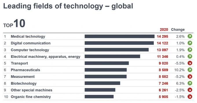 이에 따라 의료 기술(+2.6%)은 작년 가장 많은 특허가 출원되면서 2019년 1위를 차지한 디지털 커뮤니케이션 분야를 제치고 올해 1위를 재탈환했다. 반면 글로벌 교역량 감소로 인한 직격탄을 받은 수송 분야는 가장 큰 폭(-5.5%)으로 하락했다.