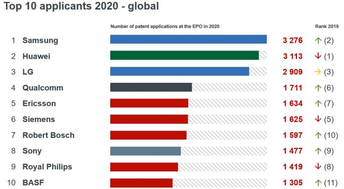 유럽 특허청(EPO)이 16일 발간한 '2020년 EPO 특허 지수'에 따르면, 지난해 삼성은 3276개의 특허를 출원해 전년도인 2019년 1위를 기록했던 화웨이를 제치고 전 세계 기업별 순위 1위를 재탈환했다.