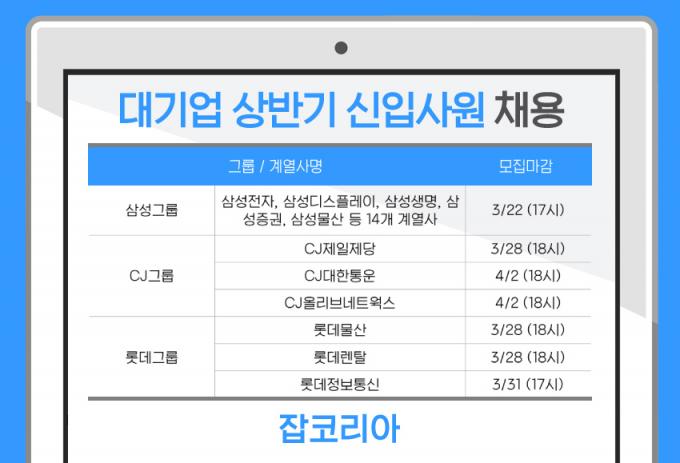 17일 취업플랫폼 잡 코리아가 신입 사원을 모집 중인 대기업 채용 공고를 정리한 자료에 따르면, 삼성그룹이 올 상반기 3급(대졸) 신입 사원 공채에 나섰다.