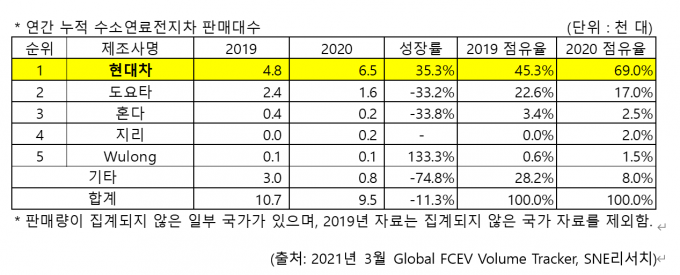 현대차의 수소차가 '6000대 판매'를 돌파한 건 작년이 처음이었다. 이에 따라 이 회사의 시장점유율은 2019년 45.3%에서 2020년 69.0%로 크게 늘었다.