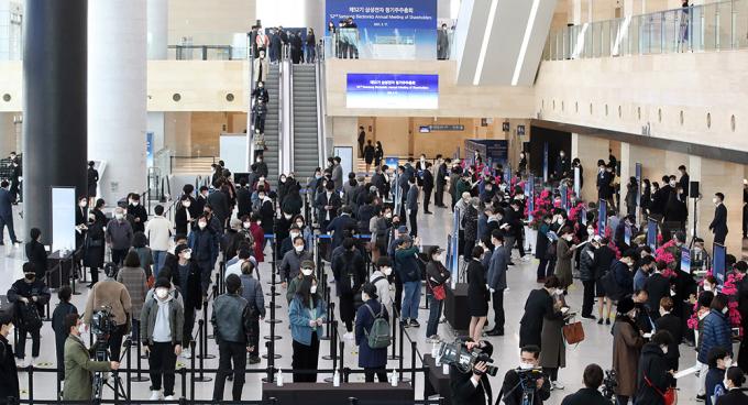 ▲ 17일 경기 수원시 수원컨벤션센터 컨벤션홀에서 열린 삼성전자 정기 주총에서 주주들이 입장하고 있다. [정병혁 기자]