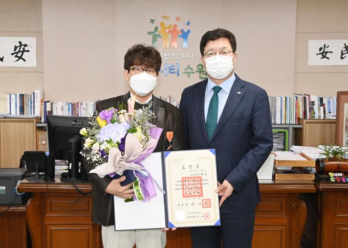 염태영 수원시장은 18일 집무실에서 시 도시안전통합센터 이병호 주무관에게 근정포장을 전수했다.