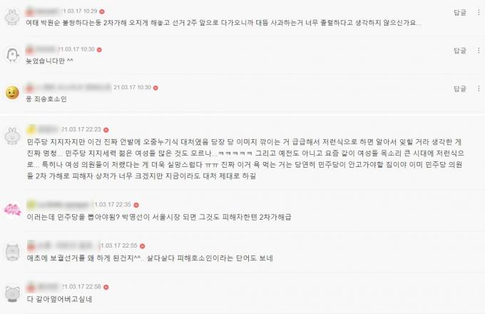 임기 초 문 대통령에 대한 찬양 일색이었던 여초 커뮤니티에선 비난이 쏟아졌다. 박 후보를 "죄송·사과·사죄 호소인"이라고 비꼬며 박 전 시장 사건 피해자를 '피해 호소인'이라고 주도한 3인방에 대한 후속 조치가 없다는 점을 지적했다. 또 "민주당 지지하지만 언발에 오줌누기식 대처였다", "여성 후보를 내세운 다른 정당을 뽑겠다"는 반응도 나왔다.