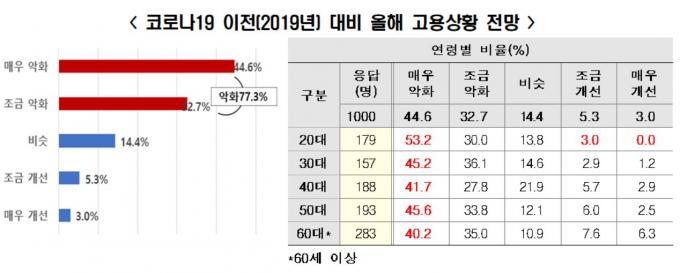 조사 결과 코로나19 이전(2019년) 대비 올해 고용 상황을 묻자 전체 응답자의 44.6%는 '매우 악화', 32.7%는 '조금 악화'라고 답했다. 개선될 것으로 보는 응답은 전체의 8.3%(조금 개선 5.3%, 개선 3.0%)에 불과했다.
