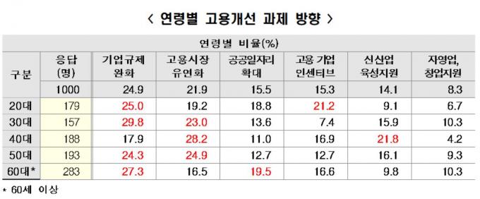 연령별로 20대는 기업규제 완화(25.0%)와 고용증가 기업 인센티브 확대(21.2%) 등 기업 활성화 정책을 지지하는 비율이 높았고, 40대는 신산업 육성 지원(21.8%)을, 60대는 공공일자리 확대(19.5%)를 꼽는 비중이 다른 연령보다 높았다.