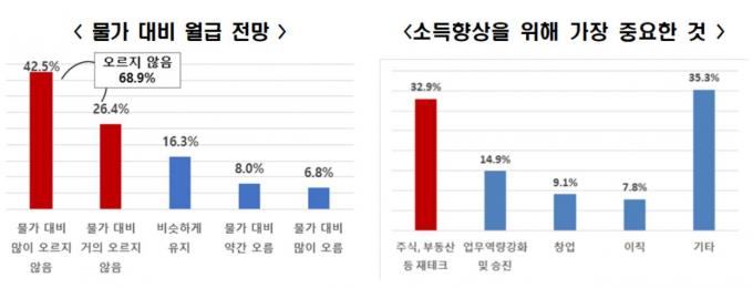 월급에 대한 전망도 암울했다. 응답자 10명 중 7명(68.9%)은 물가 대비 월급이 오르지 않을 것이라고 응답했다.