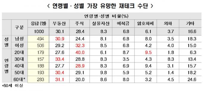 성별로 보면 남성은 부동산(30.9%)을, 여성은 주식(32.3%)을 가장 선호했다. 연령별로는 30대(33.4%)와 50대(30.4%), 60대(31.1%)는 부동산을, 20대(40.0%)와 40대(28.9%)는 주식을 가장 좋은 재테크 수단으로 꼽았다.