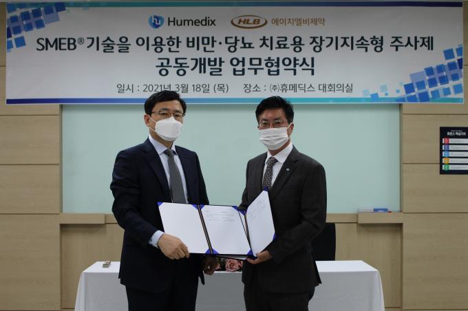 ㈜휴메딕스(대표 김진환)와 ㈜에이치엘비제약(대표 전복환)은 최근 휴메딕스 안양 본사에서 '비만∙당뇨 치료용 장기지속형 주사제의 공동연구개발을 위한 업무협약'을 체결했다고 22일 밝혔다.