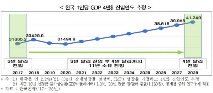 24일 전국경제인연합회 산하 한국경제연구원은 "우리나라의 1인당 GDP 4만 달러 진입 시점은 2028년으로 전망되며, 지난 2017년 GDP 3만 달러를 달성한 이후 11년이 소요될 것"이라고 분석했다.