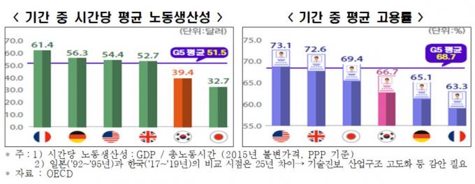 G5의 3만~4만 달러 기간 중 시간당 노동생산성은 평균 51.5달러로, 2017~2019년 한국의 시간당 노동생산성 39.4달러보다 1.3배 높았다. 또한 G5의 고용률은 평균 68.7%로 한국의 고용률 66.7%를 상회했다.