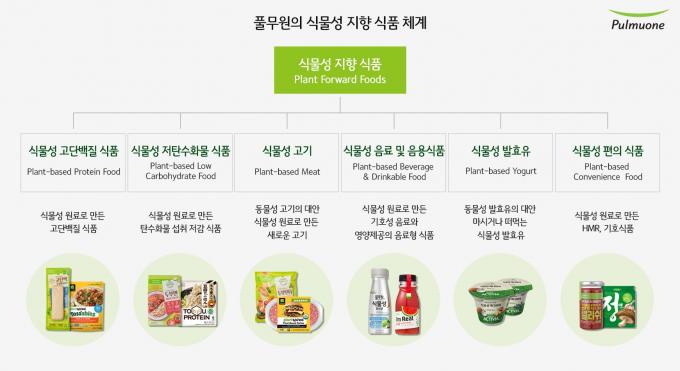 풀무원은 식물성 지향 식품을 6개 카테고리로 나누어 사업을 전개하고 있다. 이 카테고리는 ▲식물성 고단백질 식품(Plant-based Protein Food) ▲식물성 저탄수화물 식품(Plant-based Low Carbohydrate Food) ▲식물성 고기(Plant-based Meat) ▲식물성 음료 및 음용식품(Plant-based Beverage & Drinkable Food) ▲식물성 발효유(Plant-based Yogurt) ▲식물성 편의 식품(Plant-based Convenience Food)이다.