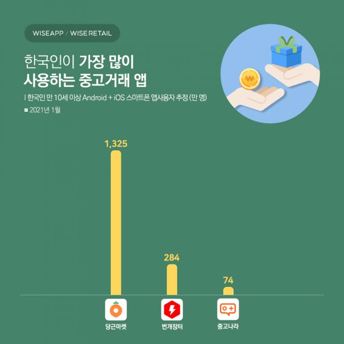 월 이용자 수는 당근마켓이 1325만 명으로 1위를 기록했다. 이어 번개장터 284만 명, 중고나라 74만 명 순이었다.