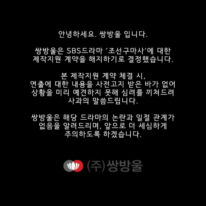 쌍방울 측은 24일 "'조선구마사'에 대한 모든 제작 지원을 철회하기로 결정했다. 해당 드라마의 내용을 사전에 세심히 챙기지 못한 점 양해 부탁드린다"면서 "'조선구마사' 논란과 쌍방울 기업은 어떠한 관계도 없음을 알려드린다"고 공지했다.