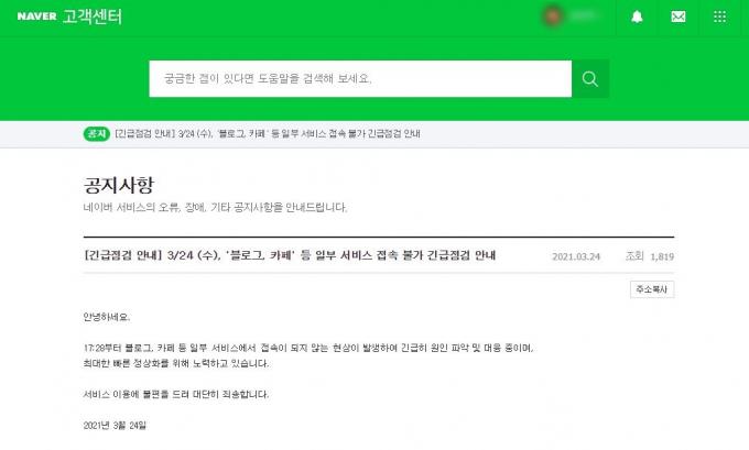 네이버 카페·블로그 서비스 공지사항에 따르면 오류가 발생한 시각은 이날 오후 5시 28분부터다.