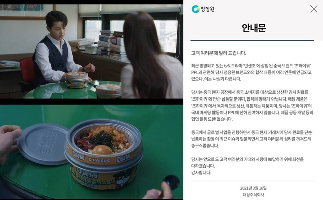 빈센조 PPL의 불똥은 대상그룹의 식품 브랜드 청정원으로 튀었다. 이에 대상그룹 청정원 측은 지난 16일 "중국 내 자사 공장에서 현지 소비자를 대상으로 생산한 김치 원료를 즈하이궈에 단순 납품할 뿐"이라며 "합작 형태가 아니다"라고 밝혔다. 또 "해당 제품은 즈하이궈가 독자적으로 생산·유통하고 있다"면서 "당사는 즈하이궈의 국내 마케팅 활동이나 PPL에 관여하지 않는다"고 해명했다.