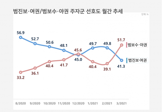 범보수·야권 주자군(윤석열·오세훈·홍준표·안철수·유승민·원희룡·나경원)은 12.6%p 오른 51.7%, 범진보·여권 주자군(이재명·이낙연·추미애·정세균·심상정·임종석·박용진)은 8.5%p 내린 41.3%를 차지했다.