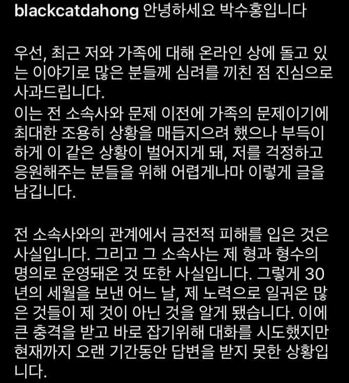 박수홍은 29일 반려묘인 '다홍'의 인스타그램 계정을 통해 "최근 저와 가족에 대해 온라인상에 돌고 있는 이야기로 많은 분들께 심려를 끼친 점 진심으로 사과드린다"고 밝혔다.