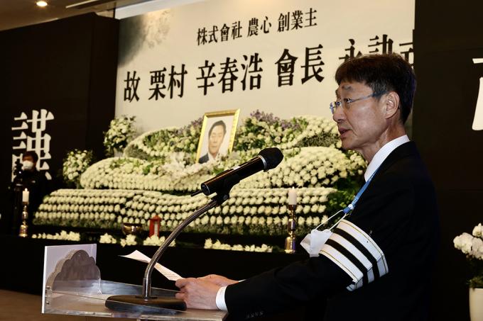 ▲ 30일 오전 서울 동작구 농심 본사에서 엄수된 농심 창업주 신춘호 회장의 영결식에서 신동원 농심 부회장이 유가족 대표로 인사말을 하고 있다. [정병혁 기자]