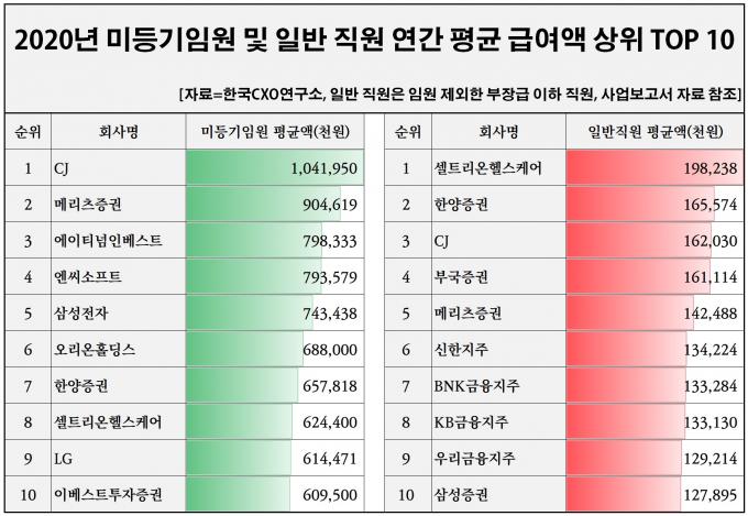 2020년 미등기임원 연봉은 △1위 CJ(10억4195만 원) △2위 메리츠증권(9억461만 원) △3위 에이티넘인베스트(7억9833만 원) △4위 엔씨소프트(7억 9357만 원 ) △5위 삼성전자(7억4343만 원) △6위 오리온홀딩스(6억8800만 원) △7위 한양증권(6억5781만 원) △9위 셀트리온헬스케어(6억2440만 원) △9위 LG(6억1447만 원) △10위 이베스트투자증권(6억960만 원) 순으로 나타났다.