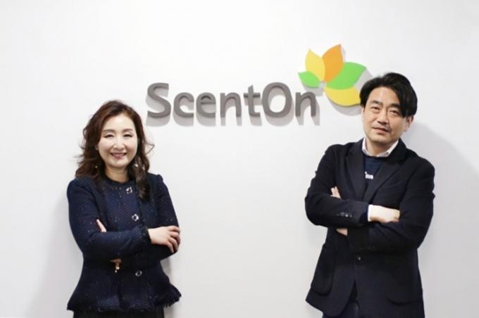 ▲ 센트온과 세종대 빅데이터 연구팀이 '인공지능(AI) 향기추천 알고리즘'을 공동 개발했다. 사진은 센트온 유정연 대표(왼쪽)와 세종대 우종필 교수. [센트온 제공]