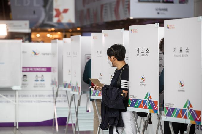 ▲ 지난 2일 서울 용산구 서울역에 마련된 남영동 사전투표소를 찾은 유권자들이 투표를 하고 있다.[정병혁 기자]