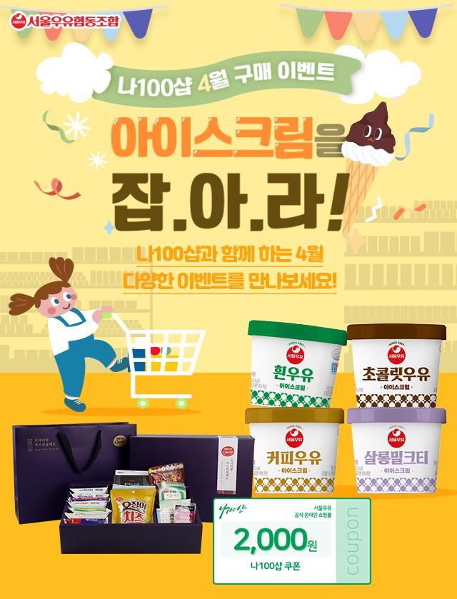 '나100샵' 구매 고객을 대상으로 진행되는 '아이스크림을 잡아라' 이벤트는 최종 결제 금액 기준 1만 원당 쇼핑 카트 1칸씩 이동이 가능하며, 10칸 모두 이동 시 '서울우유 소용량 아이스크림 100㎖' 4종을 획득할 수 있다. 이동 횟수는 구매확정 후 자동 적립되나, 이동은 버튼을 눌러 직접 진행해야 이벤트 참여가 완료된다.