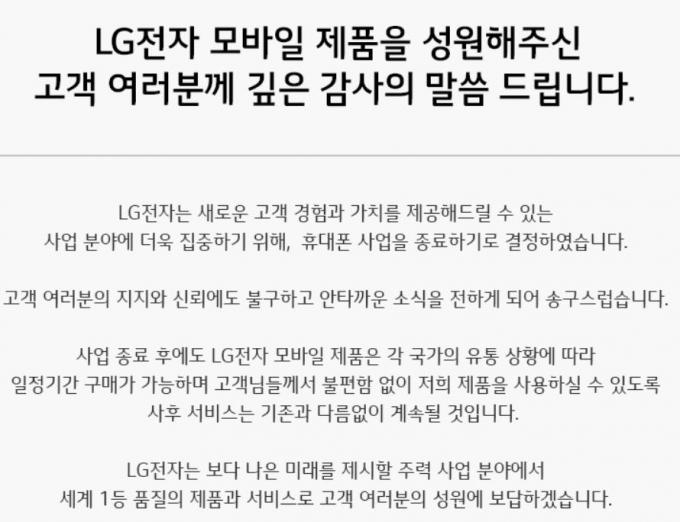 LG전자는 휴대폰 사업 종료 후에도 구매 고객 및 기존사용자가 불편을 겪지 않도록 충분한 사후 서비스를 지속한다. 아울러 사업 종료에 따른 거래선과 협력사의 손실에 대해서는 합리적으로 보상하기 위해 지속적으로 협의할 예정이다.