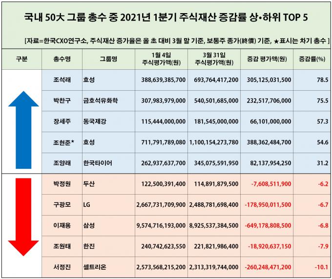한국CXO연구소는 6일 이 같은 내용을 담은 '2021년 1분기 국내 50대 그룹 총수 주식재산 변동 현황 분석'을 내놓았다. 조사 대상은 공정거래위원회가 관리하는 대기업 집단 중 동일인에 해당하는 총수가 있는 50대 그룹이다. 여기에 차기 총수로 유력한 현대자동차 정의선·효성 조현준 회장이 포함됐다.